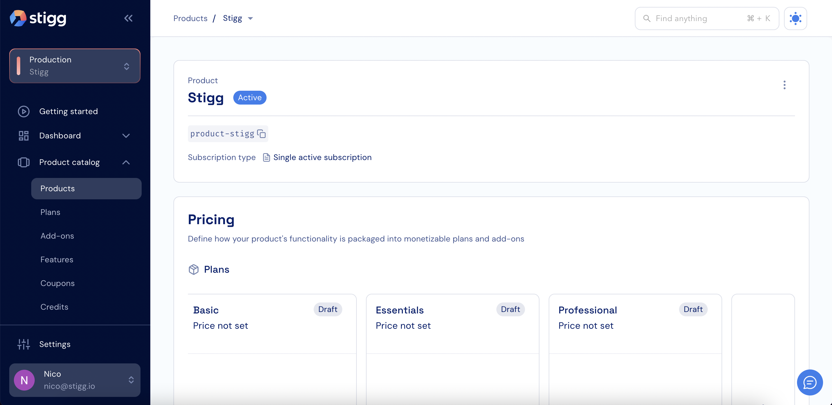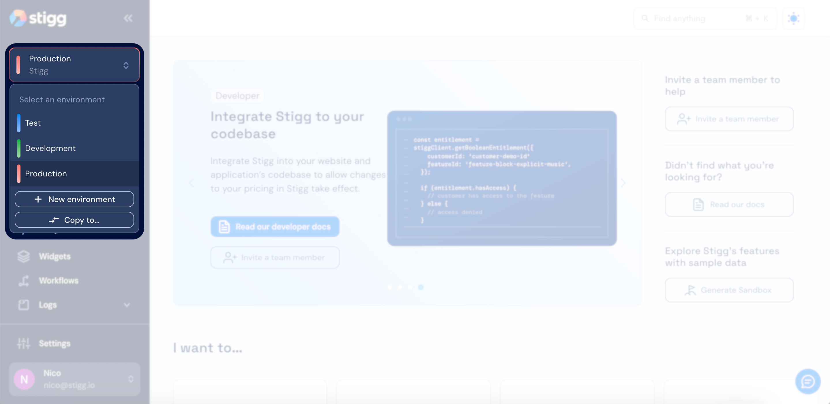 Stigg supports the creation of multiple environments in each account in order to support your existing product development process. Every environment is isolated from one another. Select the environment that will be used for the initial integration of Stigg with your application.
