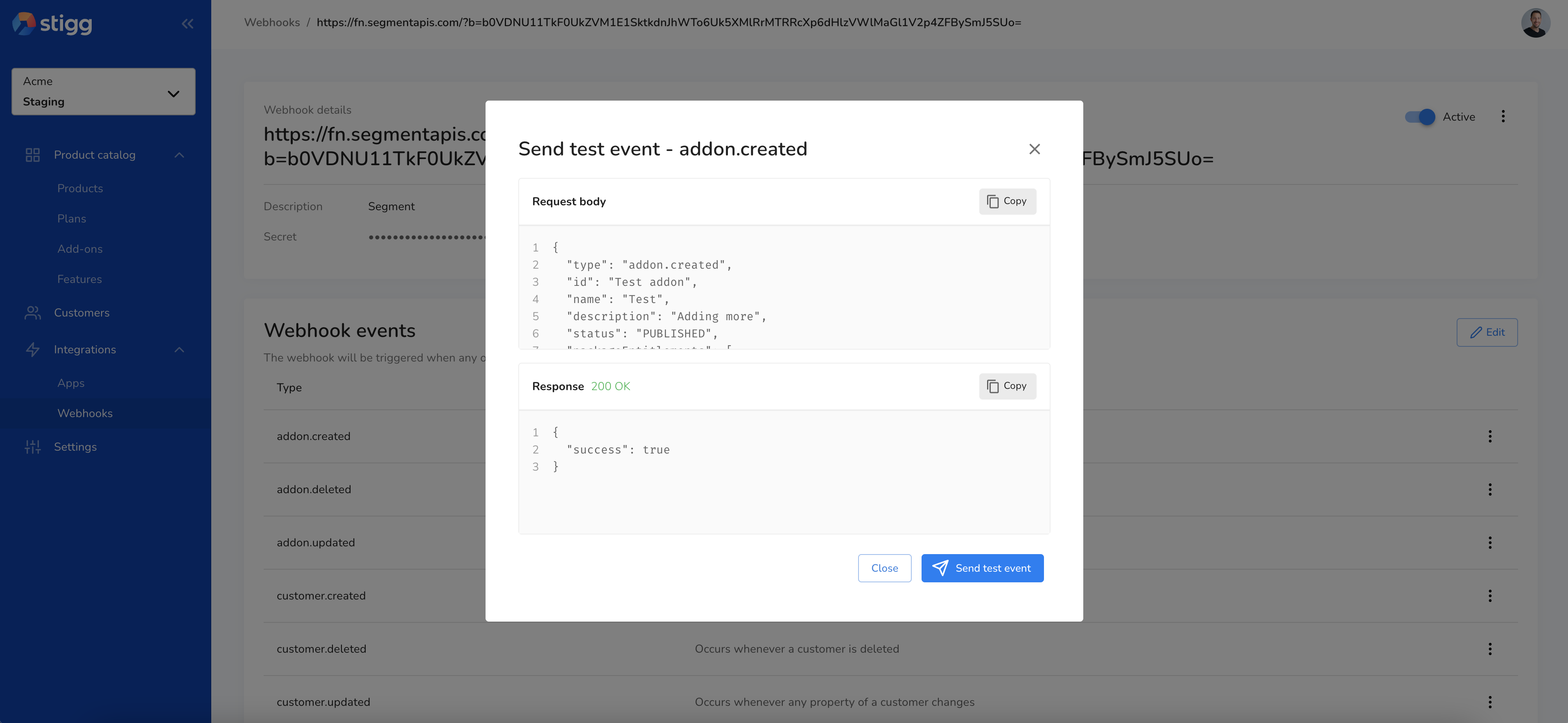 To view the details of specific webhook, click on the relevant row in the webhook list screen.Stigg will include a webhook secret in the header of sent events. Use this value to validate that requests to the defined endpoint URL originate from Stigg.