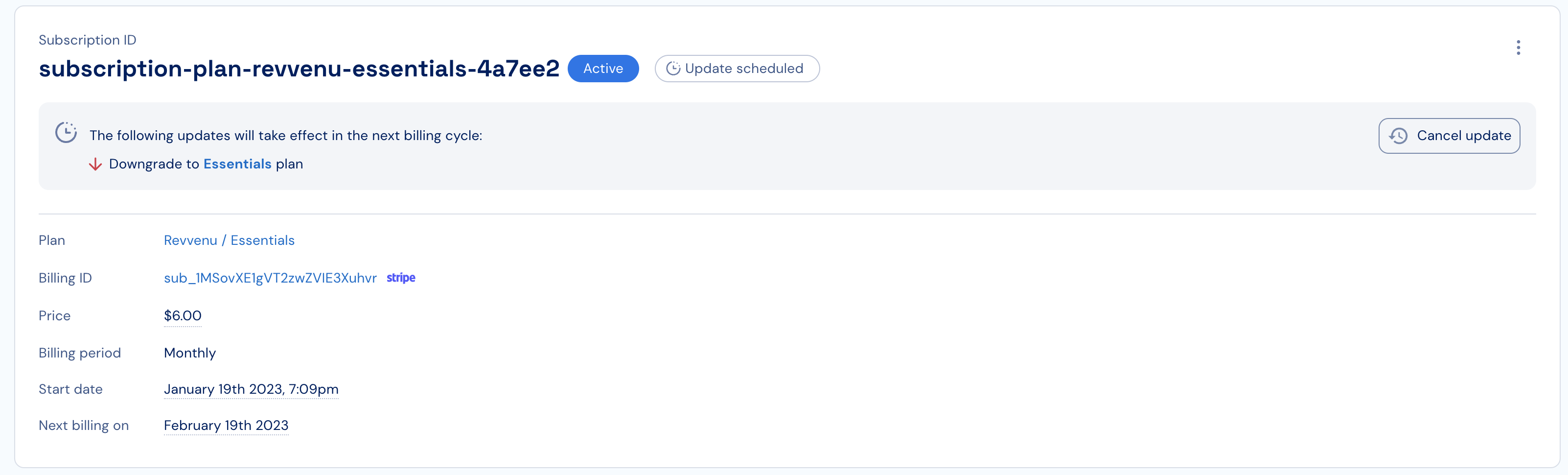 - When the subscription has scheduled updates (for example: downgrade to a lower tier) - details about what updates are currently scheduled to take effect and when.