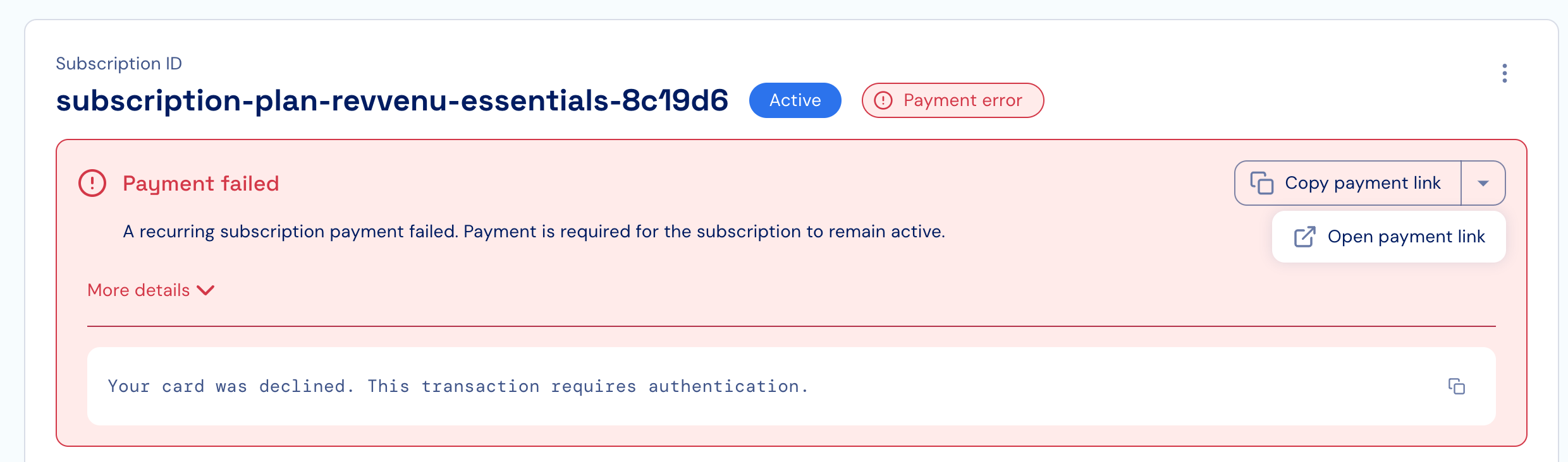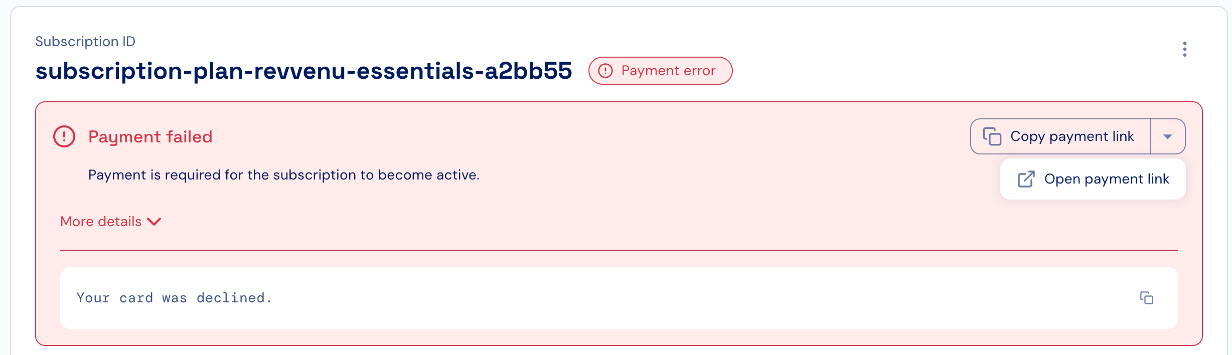 When payment for a subscription fails, the subscription will appear with a “Payment error” status, as well as with a description of the error that was encountered. When applicable, Stigg will provide you with a payment link that you can copy and send to the relevant customer, or open directly from the Stigg app to complete the payment for the subscription. In any case, customers will only have access to entitlements that they paid for.Receiving notifications about failed payments requires Stigg to be integrated with a billing solution.