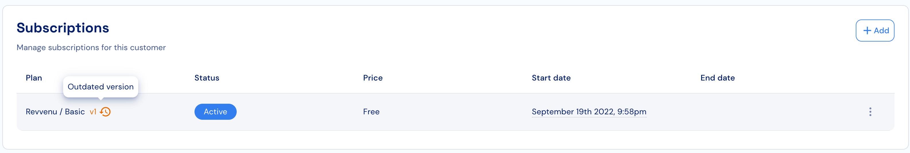 To cancel a subscription, click on the dotted menu icon of the relevant row, and select the “Cancel subscription” action. In the opened modal, select when the subscription will be cancelled:- At the end of the current billing cycle or trial period - not relevant for plans with a custom price or trial subscriptions.