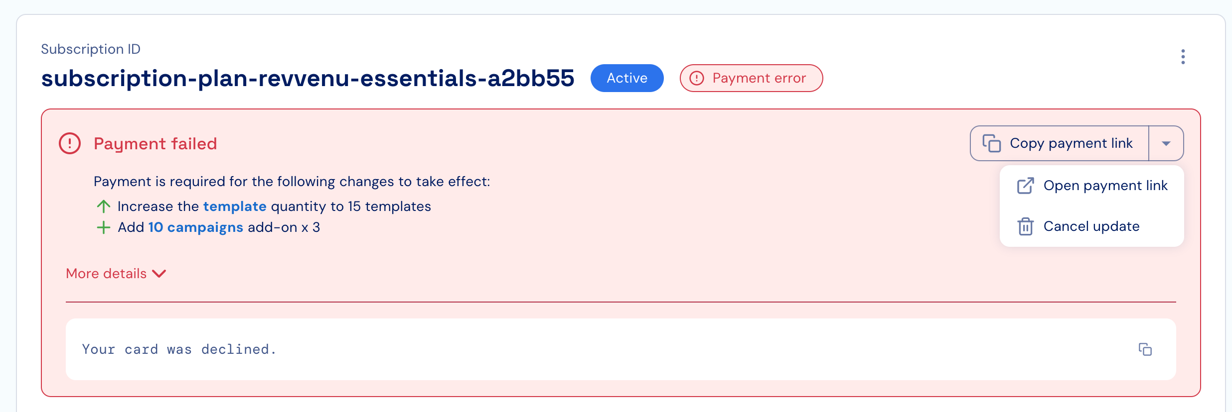 When payment for an update of an existing subscription fails, customers will still have access to the entitlements of the subscription before the update attempt took place. This is also indicated by the fact the subscription as an “Active” status in addition to the “Payment error” status. In this state, the following flows are supported:- Canceling the update, which will keep customers with the same entitlements that they had before the subscription update attempt.