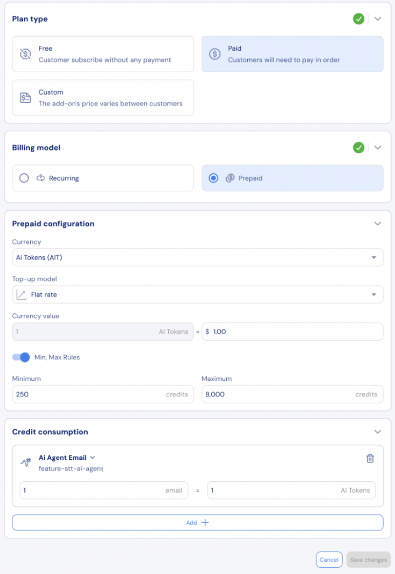 In the Prepaid configuration section, define how customers purchase and top up credits:- Currency: choose the credit type (e.g., AI Tokens (AIT)).
