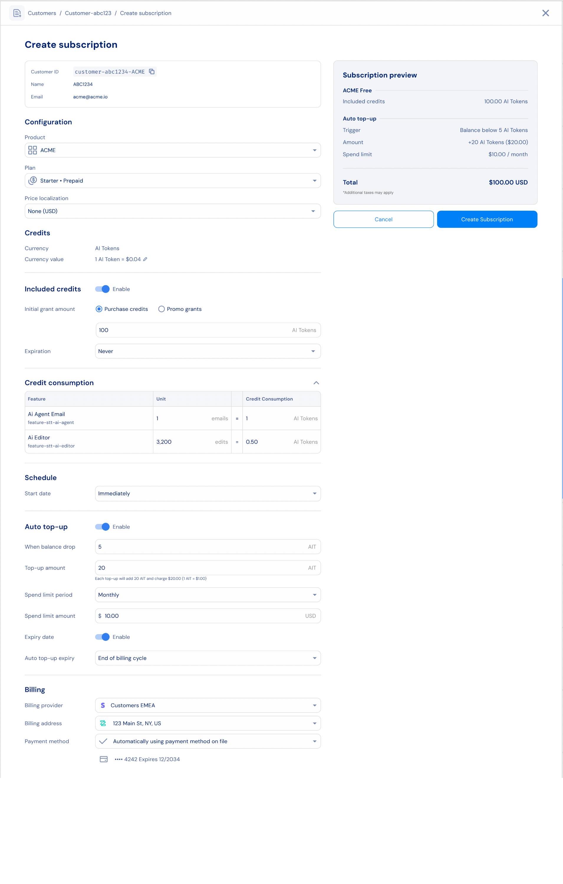 - Admin adjustments: Admins can manually add or deduct credits from a subscription through the Credit adjustment process.