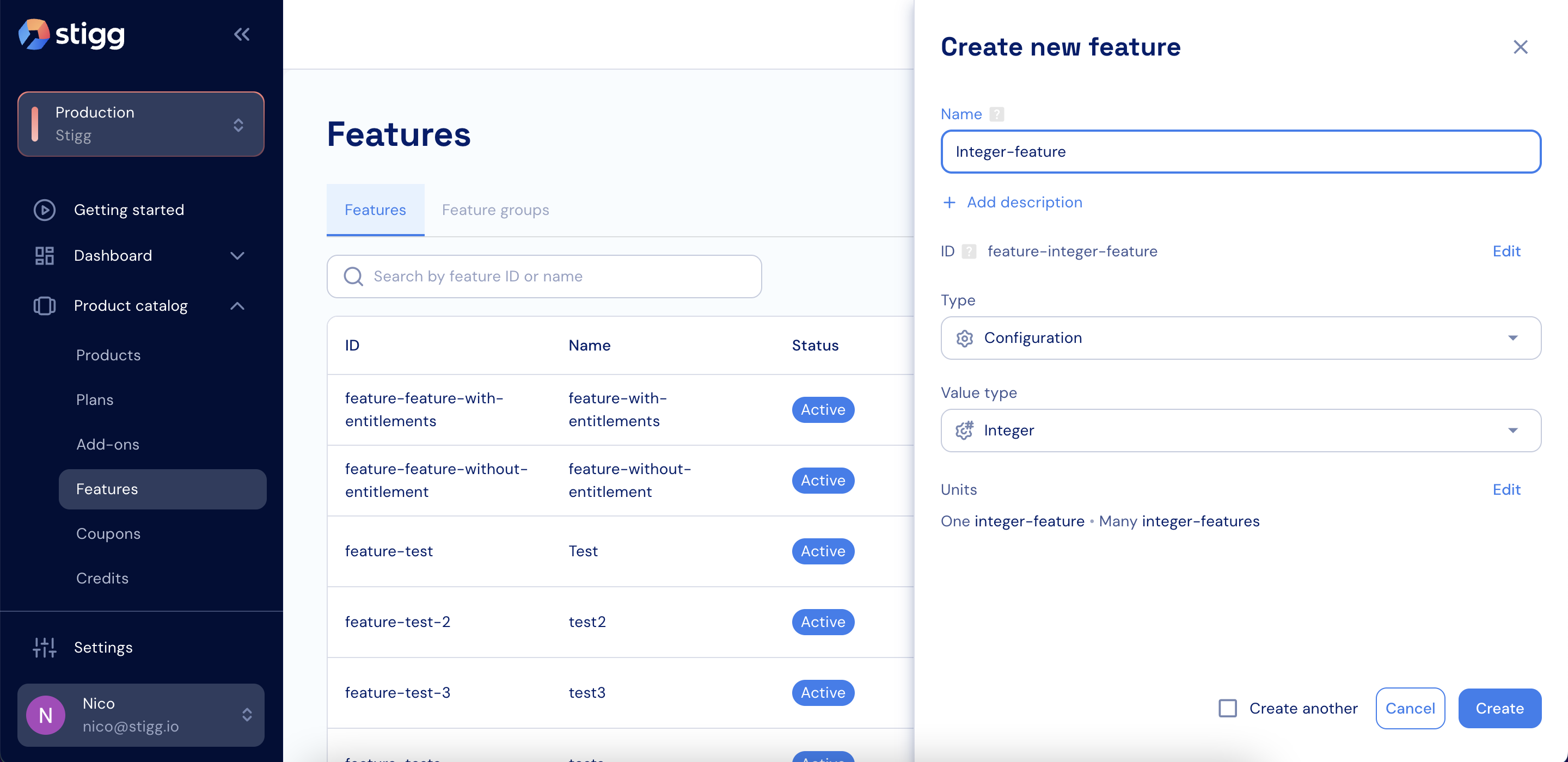To create an integer configuration feature:- Open the Product catalog in the Stigg Console.