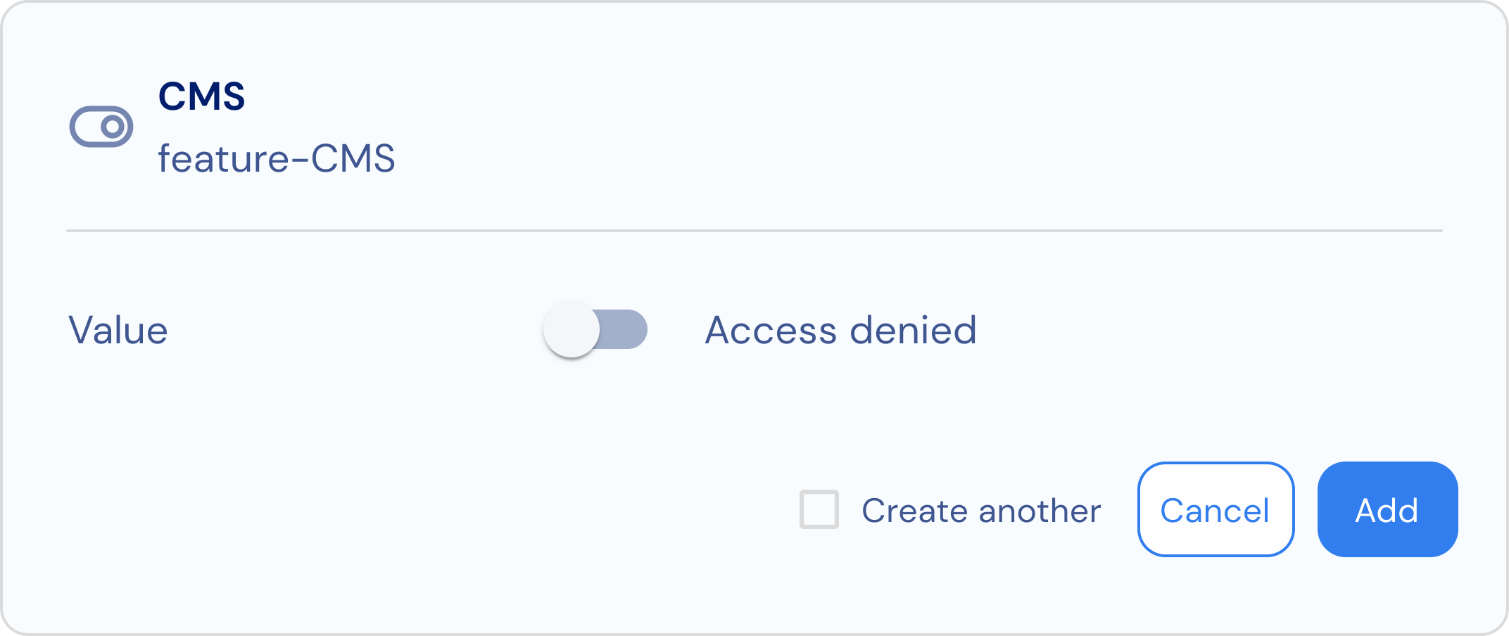 Boolean features work with an on/off toggle. When the toggle is on, access is granted; when the toggle is off, access is denied. No additional configuration is required—simply adding a Boolean feature will automatically control access for subscribed customers.