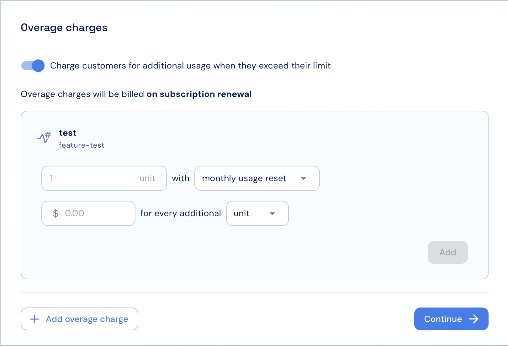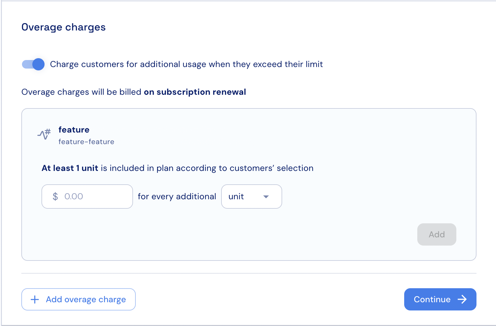 - If needed, click + Add overage charge to configure an additional charge for another metered feature.