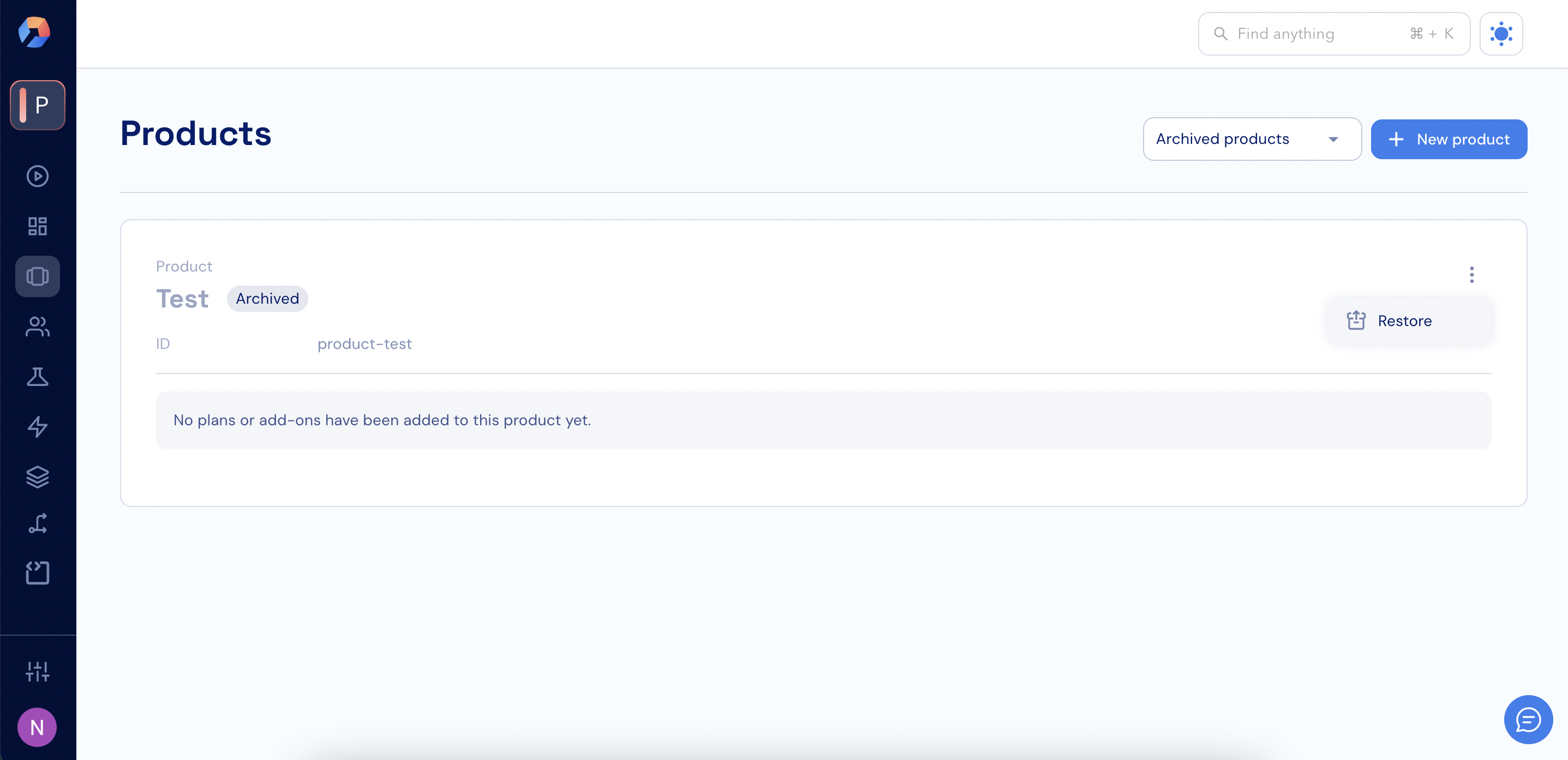 Restoring a product does not automatically restore its plans, packages, or add-ons. You must manually unarchive the relevant packages and propagate them back to the plans.Visibility of archived products