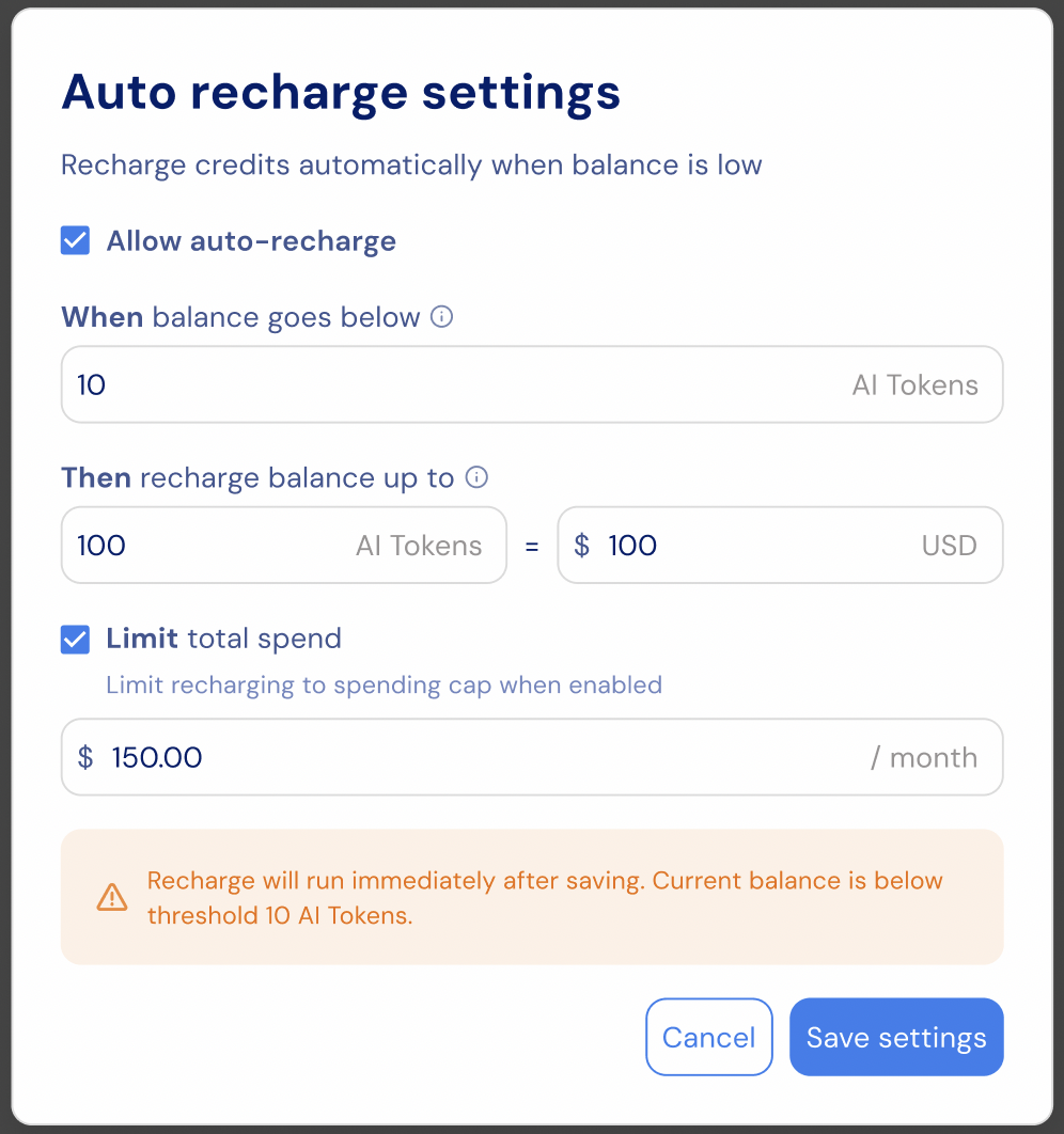 - An optional monthly spending limit to cap total recharge spend.