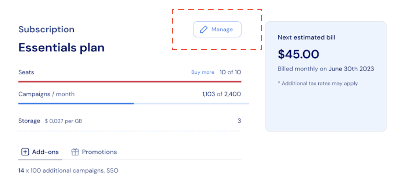 Via the Subscription Overview section: Customers can click the Manage button to adjust their subscription. By default, this button redirects users to the checkout page to manage their existing subscription. However, you can easily customize this functionality to enable cancellation by following these steps:
