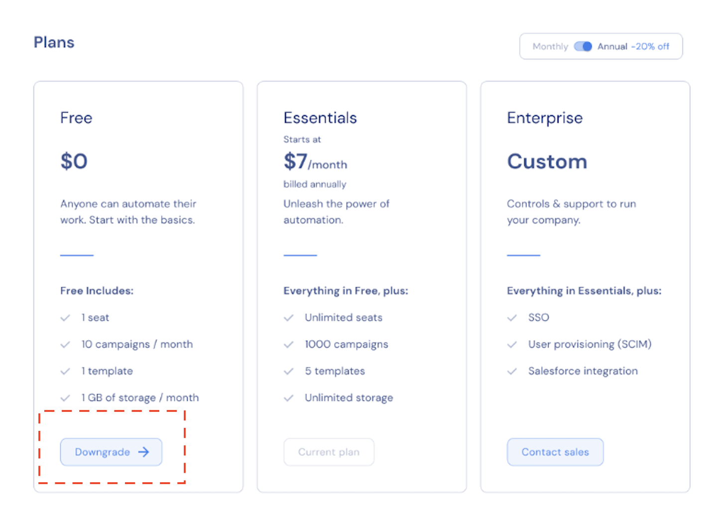- Through the Plan Picker: Customers can choose a lower-tier plan to effectively downgrade or cancel access. Options could include, for instance, a Basic plan with limited features or an empty plan, which represents account access without product usage capabilities.