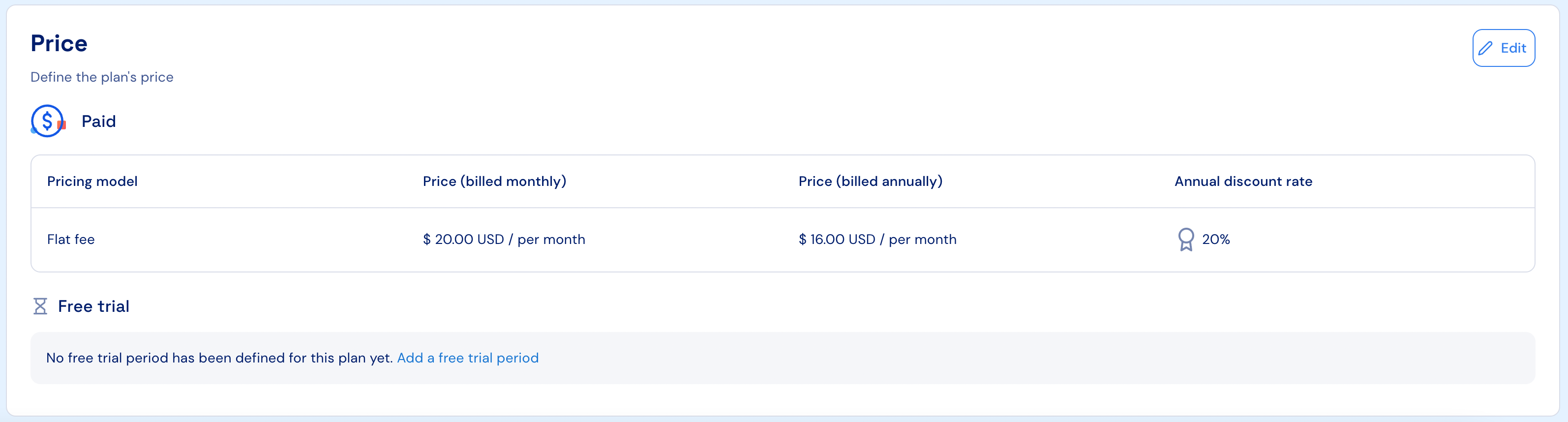 Paid and custom plans can be configured to start with a free trial period when a subscription is created. To add a free trial to a plan, select the relevant plan in the Stigg Console. Edit the plan. Under the “Pricing” section, click on. the “Add free trial” link. Set the default trial period in days or months. Click on “Add”. Publish the changes.