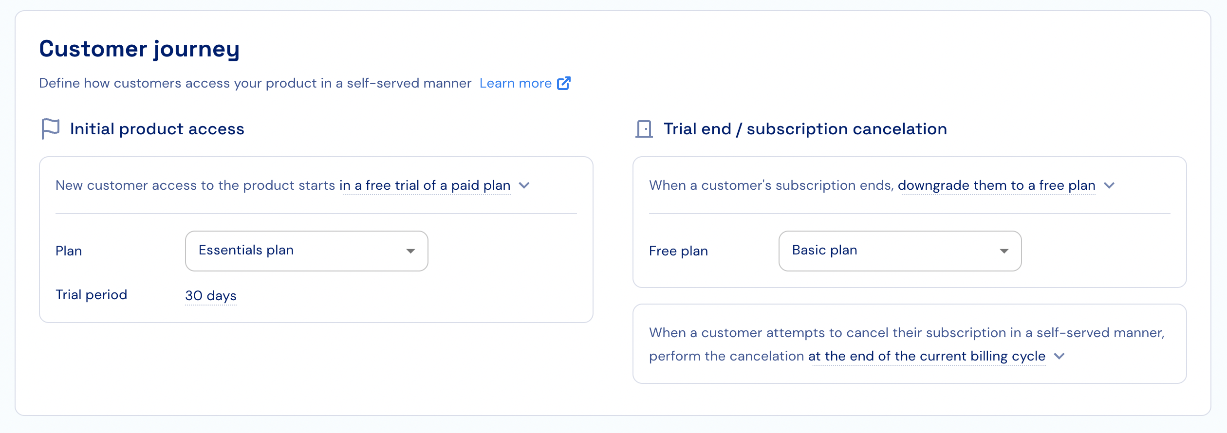 To implement a free trial flow, select the relevant product in the Product Catalog > Products section. Under the “Customer Journey” section and the “Trial end / subscription cancelation” column, select “When a customer’s subscription ends, revoke access to all of its entitlements”. Select the free plan that the customer will be downgraded to. Click “Publish changes” Confirm the action by clicking “Publish”.More details about the Customer Journey configuration can be found here.