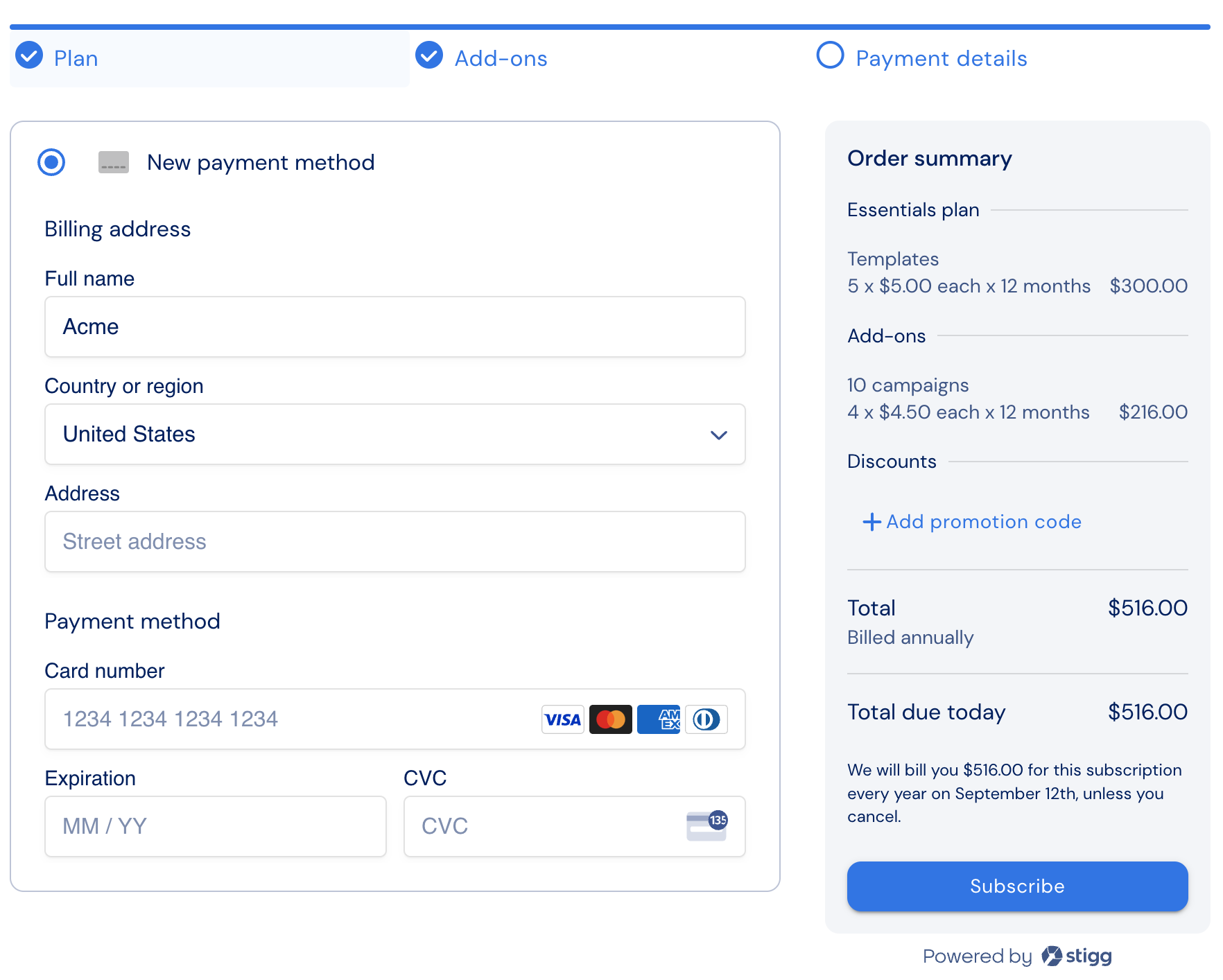 Integrate the Stigg Checkout Widget to your application. Share the promo code with customers and ask them to enter the code upon ../snap-in-widgets/checkout.