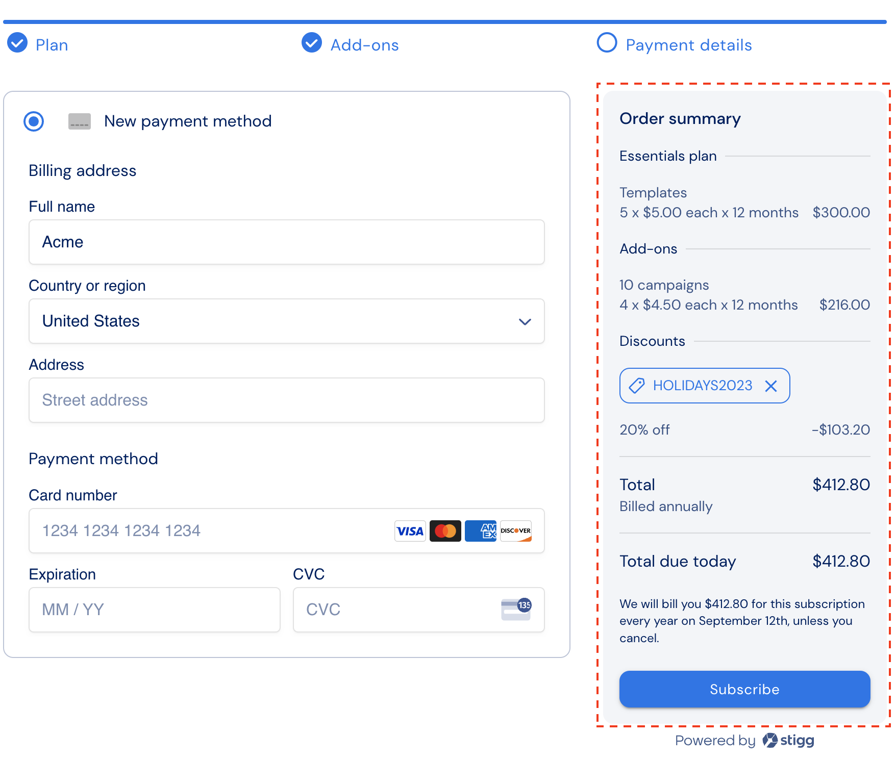 It’s recommended to avoid using one-time coupons when provisioning recurring subscriptions. This helps ensure that discounts still apply when customers update their subscription, and when changes are made to the plan and add-on prices.